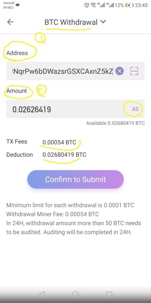 - در قسمت Amount مقدار ارز دیجیتال مورد نظر را وارد کنید . در صورت انتخاب All تمام بیت کوینهای ماین شده انتخاب میشوند .