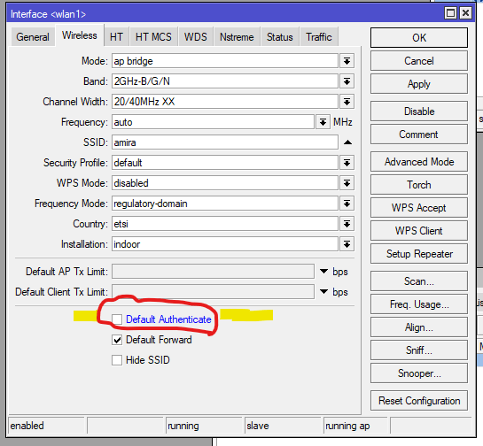 – در تب Wireless، به بخش Security مراجعه کنید. تیک مربوط به Default authentication را بردارید .