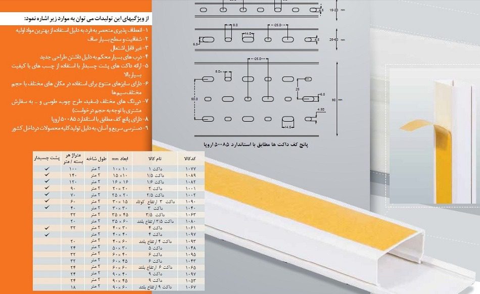 داکت شبکه: کانالی پلاستیکی است که این امکان را می دهد تا کابل های شبکه، برق و تلفن را از داخل آن عبور دهیم. استفاده از داکت چندین مزیت را در اختیار کاربران قرار می دهد که از جمله ی آن ها می توان به حفظ ظاهر و جلوگیری از شلوغ شدن محیط و حفاظت از کابل ها در برابر صدمات فیزیکی اشاره کرد. و از مزایای دیگر میتوان به صرفه بودن آن در مقابل کابلهای توکار شبکه اشاره کرد . امروزه داکتهای چسبی بدو ن نیاز به پیچ و رول پلاک و مته کاری در سریعترین زمان ممکن قابل نصب هستند .