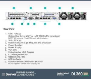 سرور HPE ProLiant DL360 Gen10 از فناوری استاندارد صنعتی با بهره گیری از پردازنده Intel Xeon Scalable با حداکثر 28 هسته، 12G SAS و 3.0 ترابایت حافظه HPE DDR4 SmartMemory 2666 MT/s پشتیبانی می کند.