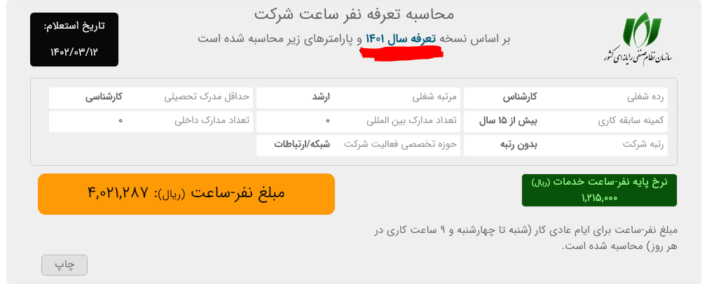 مبلغ نفر-ساعت (ریال): 4,021,287 در سال 1401 بوده و این تعرفه برای