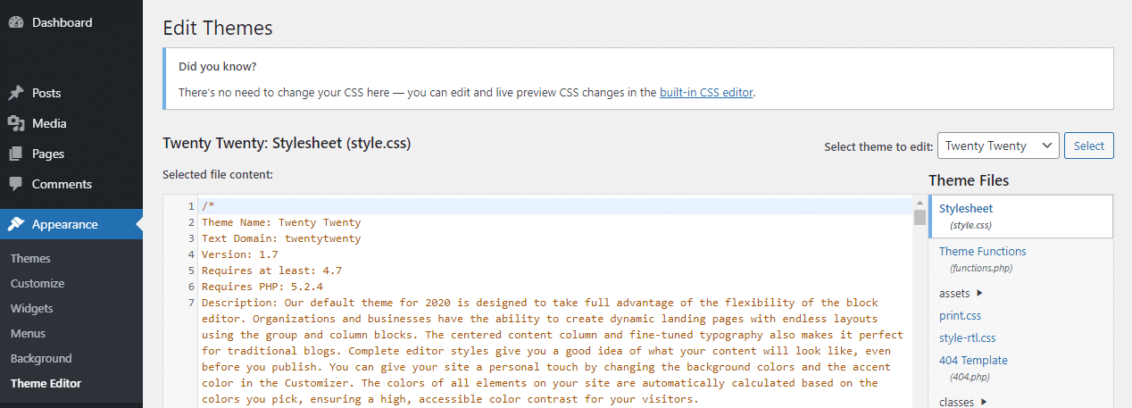 در باطن خود، میتوانید ویرایشگرهای فایل را در قسمت Appearance > Theme Editor and Plugins > Plugin Editor پیدا کنید .
