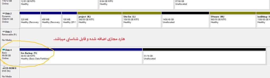 - از “Disk Management” میتوانید اطمینان حاصل کنید که دیسک متصل شده است و آماده استفاده است.