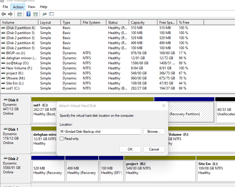 با این مراحل، فایل VHD شما به ویندوز اضافه و به آن متصل میشود.