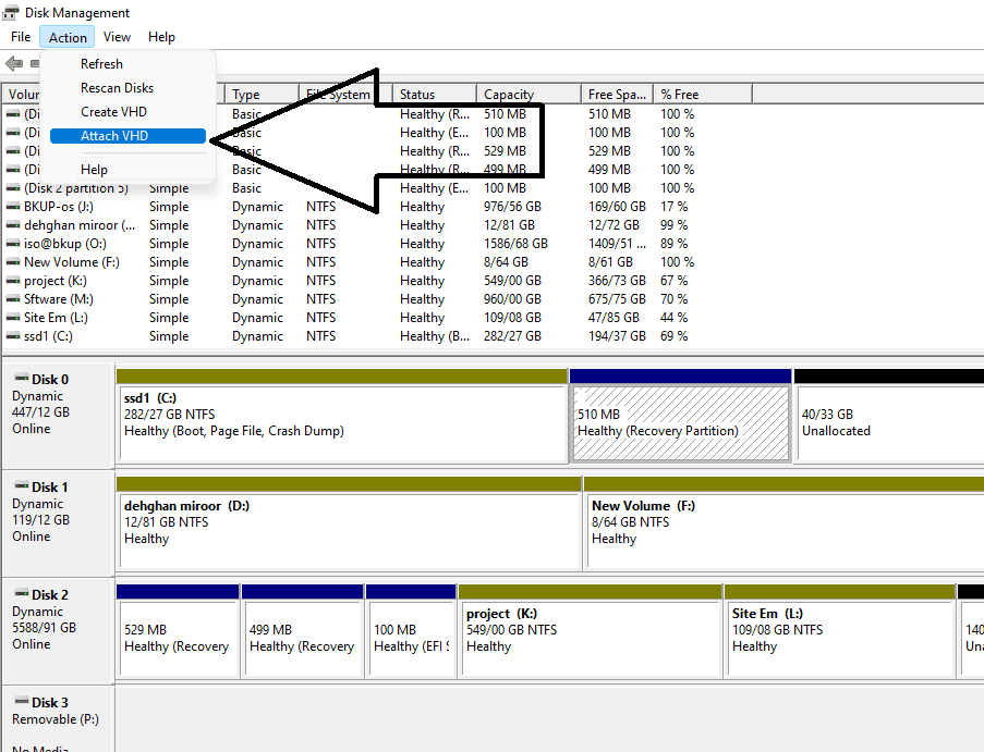 برای اضافه کردن و attach کردن یک فایل VHD به ویندوز ، میتوانید از مدیریت دیسک استفاده کنید. مراحل زیر را دنبال کنید: